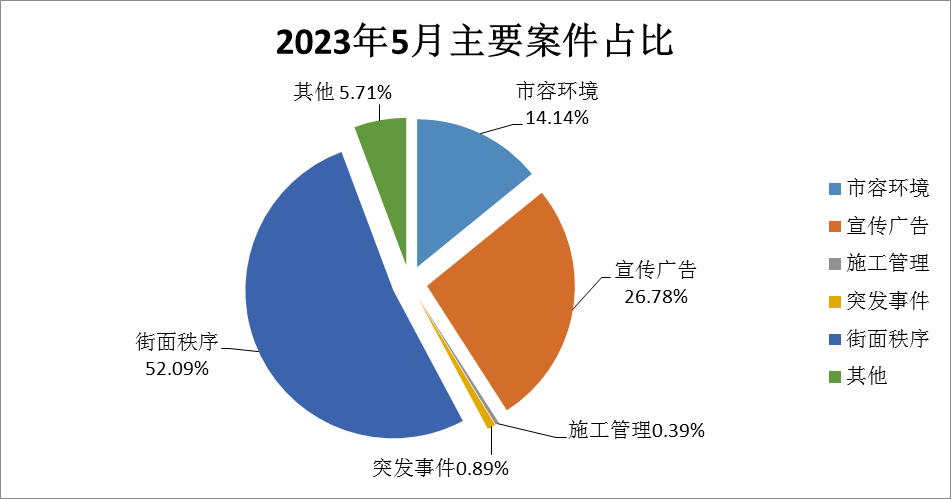 通过对4月、5月主要案件进行对比,发现城市管理领域的各类问题都呈上升趋势,特别是市容环境、街面秩序类问题较为突出,建议各县(市、区)城管部门加强巡查,及时对暴露垃圾、违规小广告、绿地脏乱等影响市容市貌现象及时处理,对占用市政道路、桥梁、人行天桥、地下通道、市场周边等公共场所进行摆摊、售卖家禽等违法行为进行执法取缔。