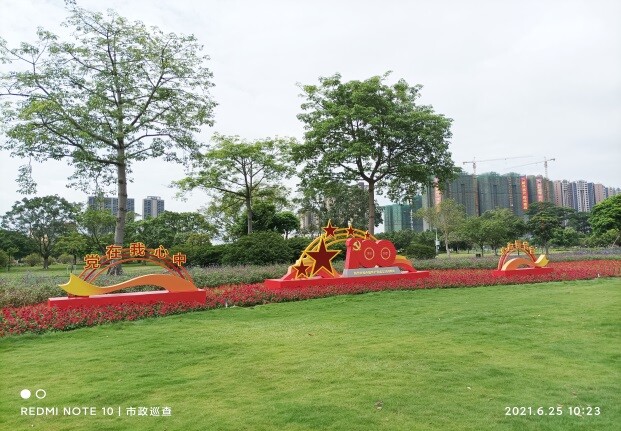 (八)东湖公园。在南门草地、北门前广场、西门门口、东门门口等节点增设花卉组景5组(其中有灯光的2组),种植、摆设花卉2.5万盆,在公园路灯悬挂国旗250支,在北园入口、东门入口等处悬挂国旗装饰物约2400米,并在园内增加“庆祝中国共产党成立100周年”主题宣传画共计50幅。