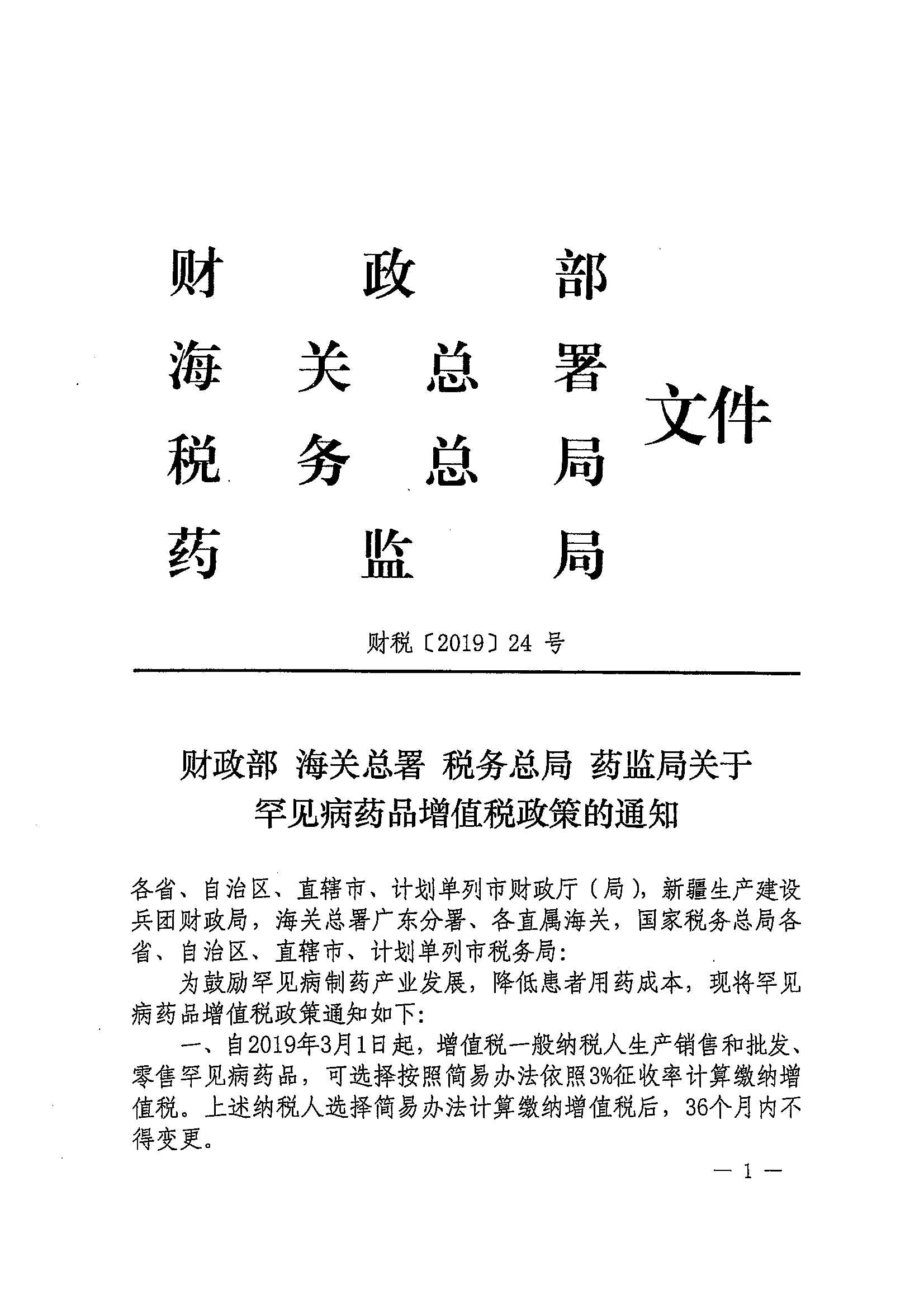 财政部 海关总署 税务总局 药监局关于罕见病药品增值税政策的通知