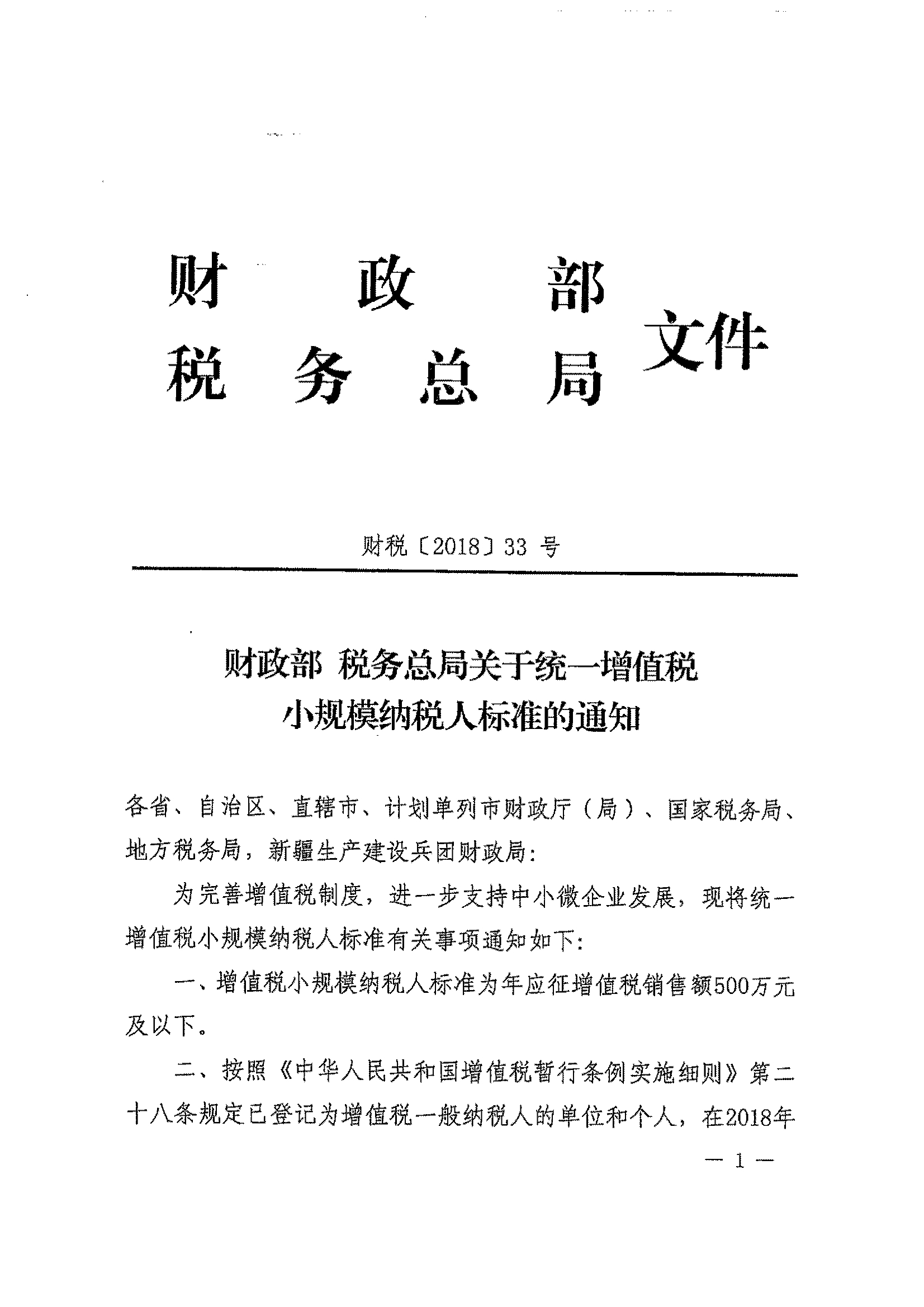 财政部 税务总局关于统一增值税小规模纳税人标准的通知