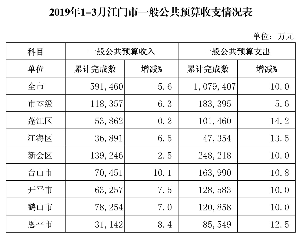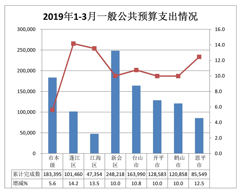 1-3月,全市一般公共预算支出完成107.94亿元,同比增长10.0%。市本级完成18.34亿元,增长5.6%。各市(区)完成情况:蓬江10.15亿元,增长14.2%;江海4.74亿元,增长13.5%;新会24.82亿元,增长10.0%;台山16.40亿元,增长10.8%;开平12.86亿元,增长10.0%;鹤山12.09亿元,增长10.0%;恩平8.55亿元,增长12.5%。