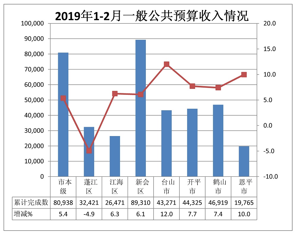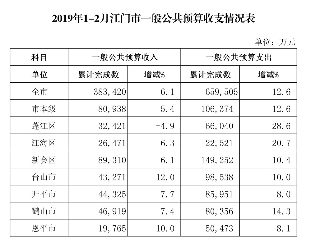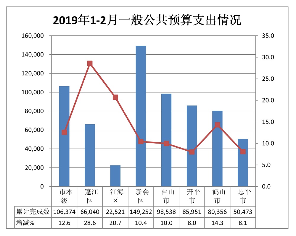 1-2月,全市一般公共预算支出完成65.95亿元,同比增长12.6%。市本级完成10.64亿元,增长12.6%。各市(区)完成情况:蓬江6.60亿元,增长28.6%;江海2.25亿元,增长20.7%;新会14.93亿元,增长10.4%;台山9.85亿元,增长10.0%;开平8.60亿元,增长8.0%;鹤山8.04亿元,增长14.3%;恩平5.05亿元,增长8.1%。