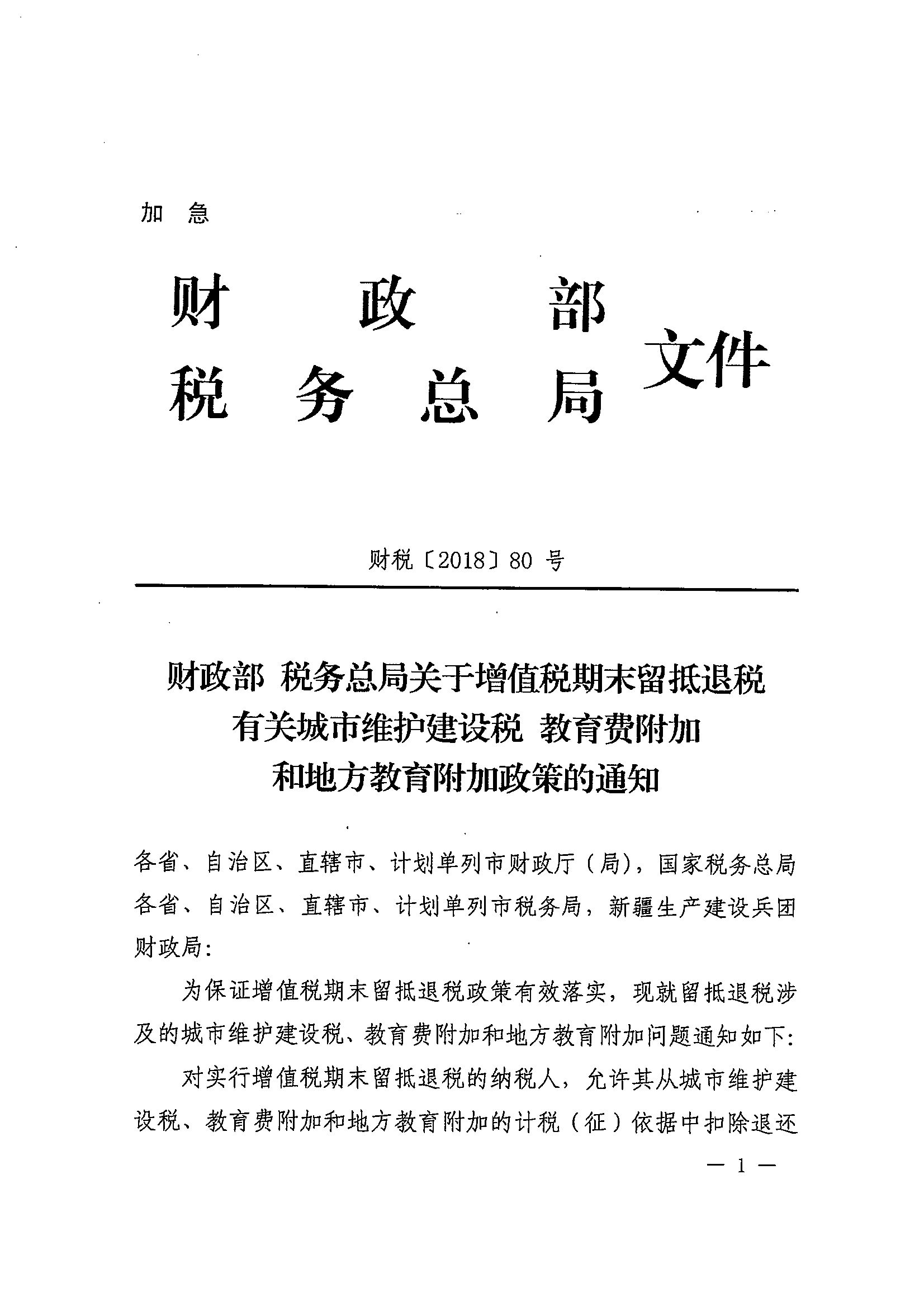 财政部 税务总局关于增值税期末留抵退税有关城市维护建设税 教育费附加和地方教育附加政策的通知