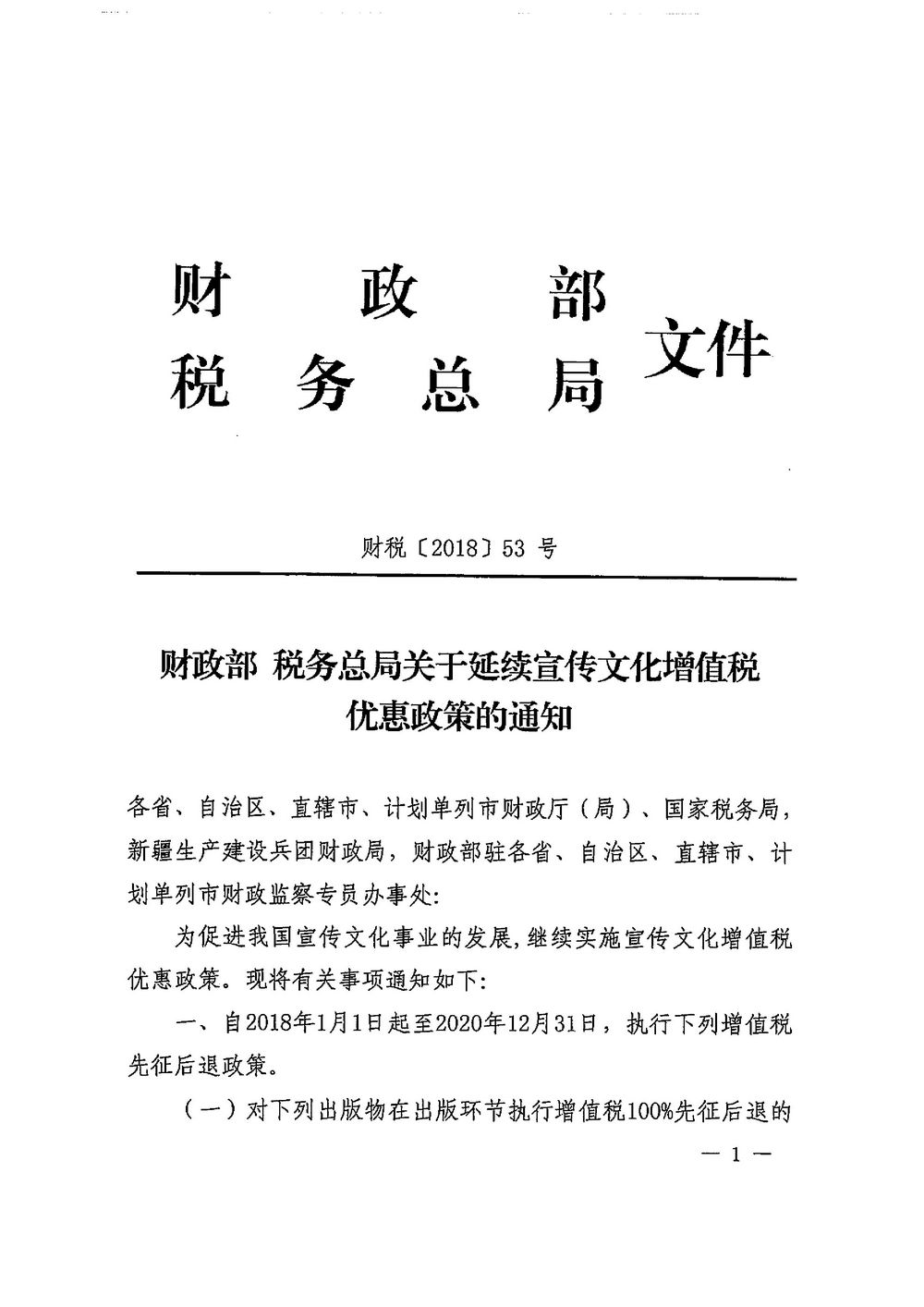 财政部 税务总局关于延续宣传文化增值税优惠政策的通知