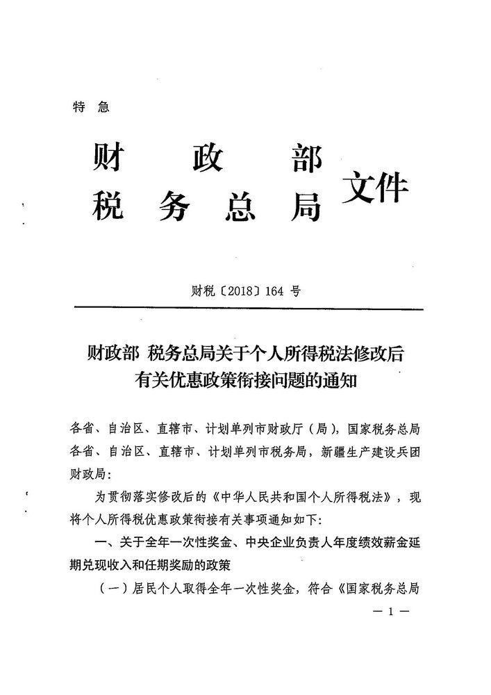 财政部 税务总局关于个人所得税法修改后有关优惠政策衔接问题的通知