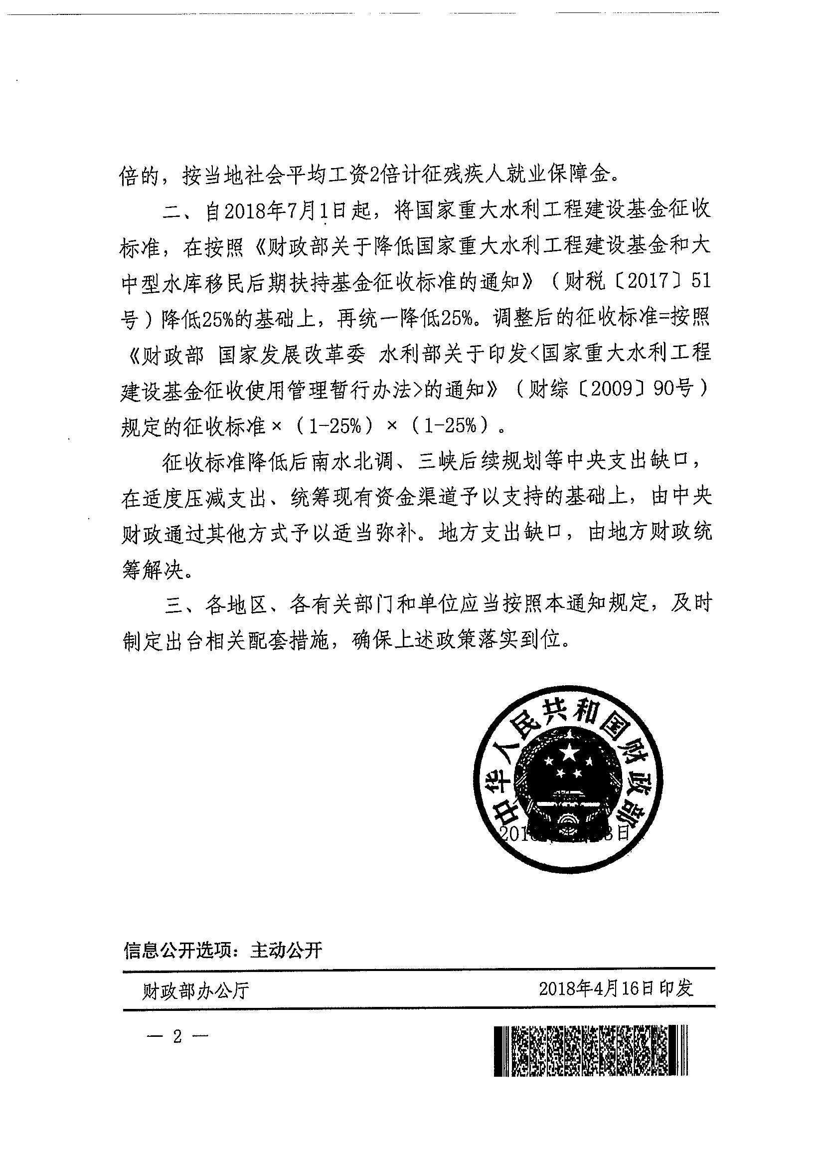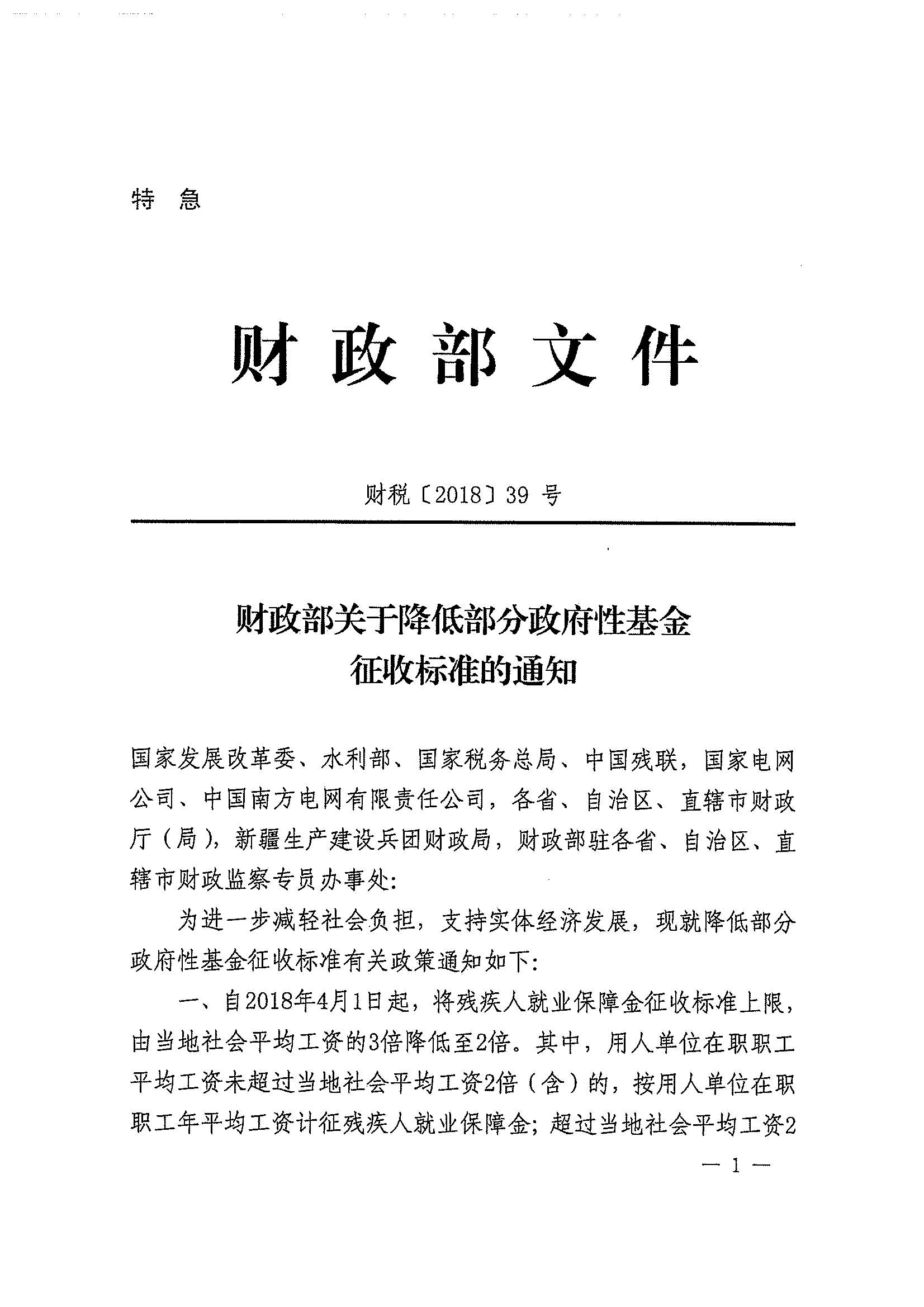 财政部关于降低部分政府性基金征收标准的通知
