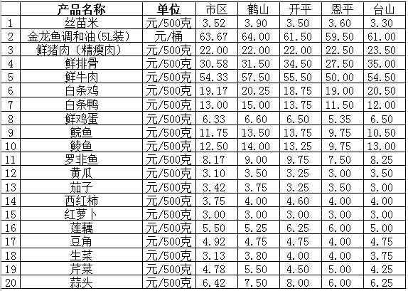 说明:1、表中价格为该地区监测点综合平均价;2、“市区”含蓬江区、江海区、新会区,价格分别采自蓬江市场、江南市场、城东市场等6家农贸市场;3、其他四个县市价格分别采自新鹤市场、锦江市场等8家农贸市场。
