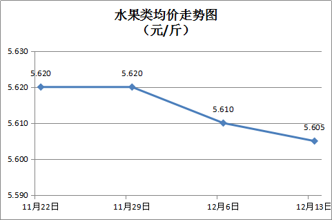 水果类商品价格稳中有降。所监测的6种水果综合均价为5.605元/斤,环比下降0.09%。其中橙子、苹果、香蕉零售均价分别为每斤5.78元、6.29元、2.81元,环比分别下降0.52%、持平、持平。