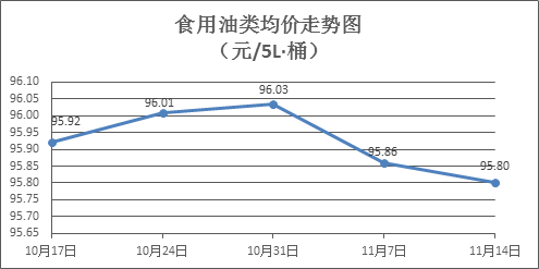 食用油类商品价格稳中微降。本周所监测的9种食用油(5L装)商品价格波动情况为2涨4跌3平,综合零售均价为95.80元/桶,环比下降0.06%。其中:鲁花花生油、金龙鱼调和油零售均价分别为每桶158.42元、69.71元,环比分别下降0.10%、下降0.16%。