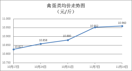 禽蛋类商品价格微幅波动。本周所监测的6种禽蛋类商品价格波动情况为1涨2跌3平,综合零售均价为10.960元/斤,环比上涨0.08%。其中:白条鸡、白条鸭零售均价分别为每斤20.39元、15.45元,环比分别下降0.39%、上涨1.05%;红壳鸡蛋、鸭蛋零售均价分别为每斤6.87元、7.64元,环比分别持平、下降0.39%。