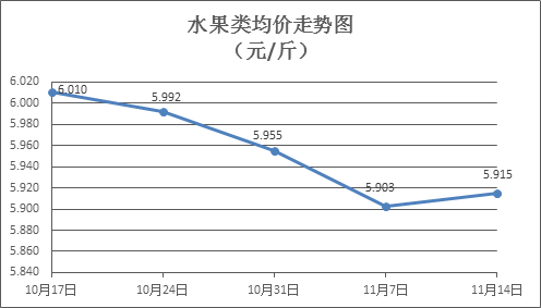 水果类商品价格窄幅盘整。本周所监测的6种水果商品价格波动情况为2涨4跌,综合零售均价为5.915元/斤,环比上涨0.20%。其中橙子、葡萄、梨零售均价分别为每斤6.38元、11.49元、4.87元,环比分别下降0.31%、上涨1.14%、下降0.61%。