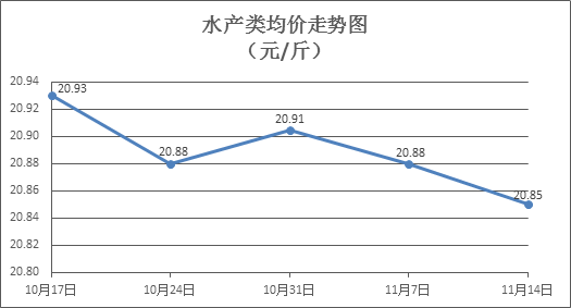 水产类商品价格总体微降。本周所监测的10种水产商品价格波动情况为3涨4跌3平,综合均价为20.85元/斤,环比下降0.13%。其中:草鱼、鳙鱼、罗非鱼、基围虾零售均价分别为每斤11.54元、10.81元、8.63元、37.58元,环比分别下降1.87%、上涨0.37%、上涨0.23%、下降0.13%。