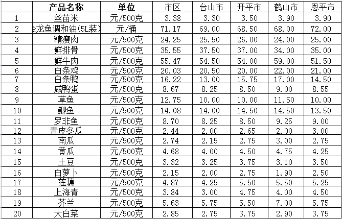 说明:1、表中价格为该地区监测点综合平均价;2、“市区”含蓬江区、江海区、新会区,价格分别采自蓬江市场、江南市场、城东市场等13家农贸市场;3、其他四个县市价格分别采自新华市场、锦江市场等8家农贸市场。