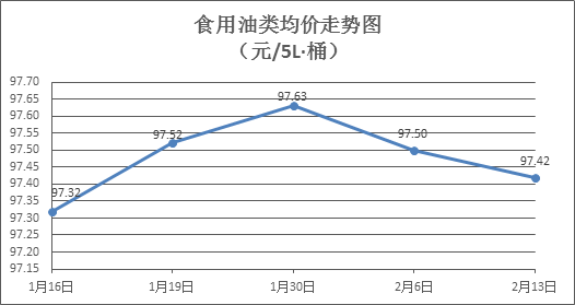 食用油类商品价格稳中微降。本周所监测的9种食用油(5L装)商品价格波动情况为3涨5跌1平,综合零售均价为97.42元/桶,环比下降0.08%。其中:鲁花花生油、大豆油零售均价分别为每桶159.15元、61.78元,环比分别下降0.06%、下降0.13%。