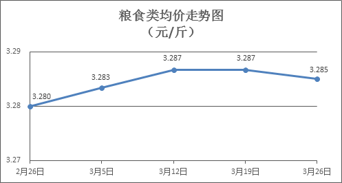 粮食类商品价格基本平稳。本周所监测的6种粮食商品价格波动情况为1跌5平,综合零售均价为3.285元/斤,环比下降0.05%。其中:晚籼米、丝苗米、标准粉零售均价分别为每斤3.26元、3.43元、3.14元,环比分别持平、下降0.29%、持平。
