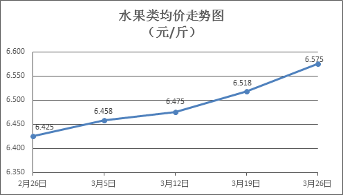水果类商品价格升降互现。本周所监测的6种水果商品价格波动情况为3涨3跌,综合零售均价为6.575元/斤,环比上涨0.87%。其中苹果、香蕉、葡萄零售均价分别为每斤7.13元、3.16元、13.00元,环比分别下降0.28%、上涨0.64%、上涨1.40%。