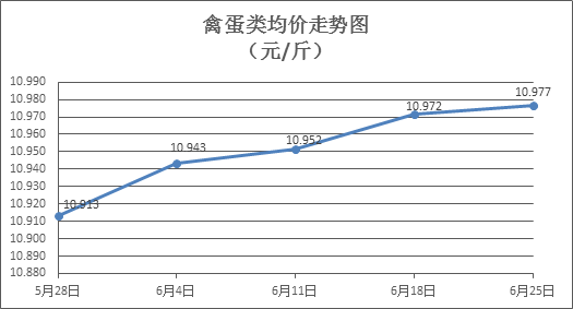 家禽类商品价格微幅盘升。上周所监测的6种禽蛋类商品价格波动情况为2涨2跌2平,综合零售均价为10.977元/斤,环比上涨0.05%。其中:白条鸡、白条鸭零售均价分别为每斤19.84元、15.69元,环比分别上涨0.20%、上涨0.26%;白壳鸡蛋、鸭蛋零售均价分别为每斤6.72元、7.90元,环比分别下降0.15%、下降0.50%。