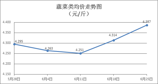 蔬菜类商品价格普遍上涨。上周所监测的32 种蔬菜商品价格波动情况为26涨5跌1平,综合零售均价为4.387元/斤,环比上涨1.70%。其中:涨幅居前的品种包括莲藕、花菜、白萝卜,零售均价分别为每斤5.32元、5.27元、2.20元,环比分别上涨7.26%、6.04%、4.76%;跌幅居前的品种包括南瓜、西洋菜、黄瓜,零售均价分别为每斤2.60元、4.25元、3.40元,环比分别下降2.99%、2.52%、1.45%。