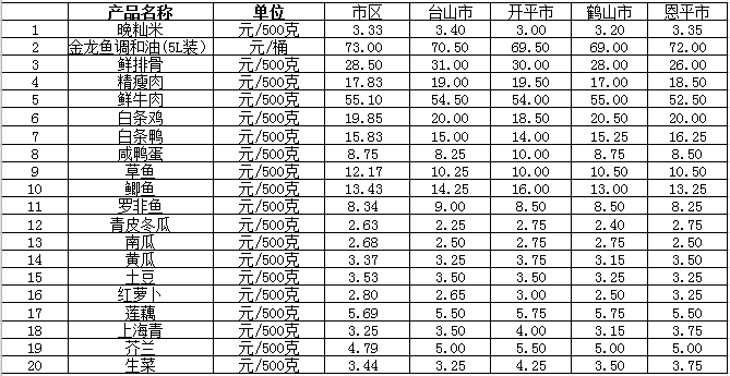 说明:1、表中价格为该地区监测点综合平均价;2、“市区”含蓬江区、江海区、新会区,价格分别采自蓬江市场、江南市场、城东市场等13家农贸市场;3、其他四个县市价格分别采自新华市场、锦江市场等8家农贸市场。