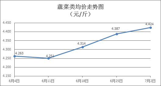 蔬菜类商品价格普遍上涨。上周所监测的32 种蔬菜商品价格波动情况为22涨8跌2平,综合零售均价为4.424元/斤,环比上涨0.84%。其中:涨幅居前的品种包括水空心菜、白苋菜、莲藕,零售均价分别为每斤3.54元、4.11元、5.55元,环比分别上涨6.95%、4.58%、4.32%;跌幅居前的品种包括西红柿、丝瓜、青皮冬瓜,零售均价分别为每斤4.30元、3.99元、2.54元,环比分别下降4.02%、2.92%、2.31%。