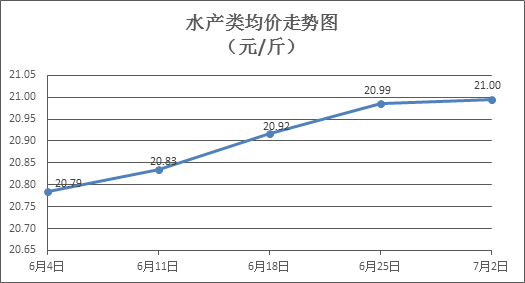 水产类商品价格微幅盘整。上周所监测的10种水产商品价格波动情况为4涨5跌1平,综合均价为21.00元/斤,环比上涨0. 04%。其中:草鱼、鲢鱼、鳙鱼、罗非鱼、基围虾零售均价分别为每斤11.10元、10.10元、10.18元、8.54元、39.12元,环比分别上涨0.36%、上涨1.00%、下降0.10%、下降0.12%、上涨0.10%。