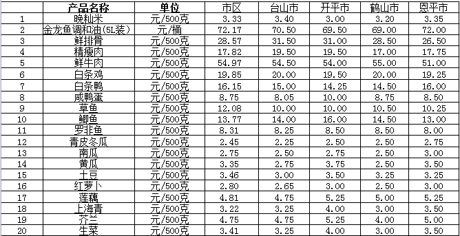 说明:1、表中价格为该地区监测点综合平均价;2、“市区”含蓬江区、江海区、新会区,价格分别采自蓬江市场、江南市场、城东市场等13家农贸市场;3、其他四个县市价格分别采自新华市场、锦江市场等8家农贸市场。