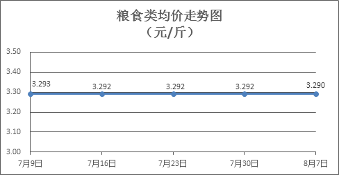 粮食类商品价格基本平稳。上周所监测的6种粮食类商品价格波动情况为1跌5平,综合零售均价为3.290元/斤,环比下降0.05%。其中:晚籼米、油粘米、标准粉零售均价分别为每斤3.26元、3.42元、3.15元,环比分别下降0.31%、持平、持平。