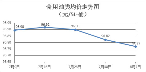 食用油类商品价格总体略降。上周所监测的9种食用油(5L装)商品价格波动情况为2涨5跌2平,综合零售均价为96.77元/桶,环比下降0.05%。其中:金龙鱼花生油、金龙鱼调和油零售均价分别为每桶105.29元、71.07元,环比分别下降0.11%、持平。