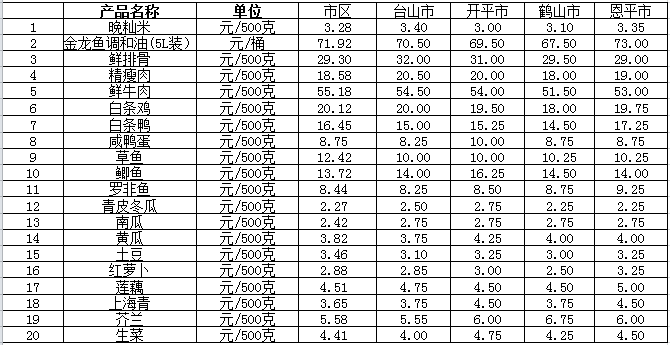 说明:1、表中价格为该地区监测点综合平均价;2、“市区”含蓬江区、江海区、新会区,价格分别采自蓬江市场、江南市场、城东市场等13家农贸市场;3、其他四个县市价格分别采自新华市场、锦江市场等8家农贸市场。