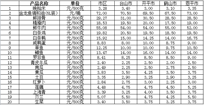 说明:1、表中价格为该地区监测点综合平均价;2、“市区”含蓬江区、江海区、新会区,价格分别采自蓬江市场、江南市场、城东市场等13家农贸市场;3、其他四个县市价格分别采自新华市场、锦江市场等8家农贸市场。