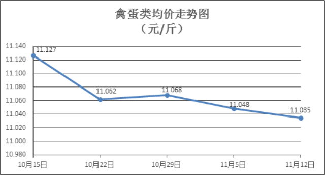 蛋类商品价格小幅下降。上周所监测的6种禽蛋类商品价格波动情况为2涨3跌1平,综合零售均价为11.035元/斤,环比下降0.12%。其中:白条鸡、白条鸭零售均价分别为每斤19.66元、15.30元,环比分别上涨0.05%、上涨0.39%;白壳鸡蛋、鸭蛋零售均价分别为每斤7.02元、8.15元,环比分别下降0.85%、下降0.37%。