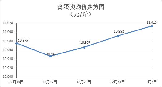 禽蛋类商品价格窄幅盘升。上周所监测的6种禽蛋类商品价格波动情况为3涨2跌1平,综合零售均价为11.013元/斤,环比上涨0.20%。其中:白条鸡、白条鸭零售均价分别为每斤20.14元、15.32元,环比分别上涨1.46%、下降0.78%;白壳鸡蛋、鸭蛋零售均价分别为每斤6.77元、7.83元,环比分别持平、下降1.88%。
