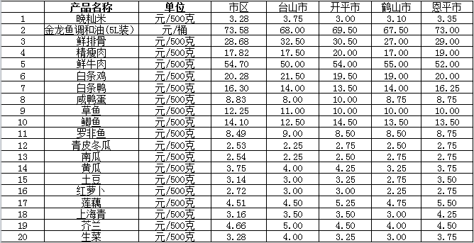 说明:1、表中价格为该地区监测点综合平均价;2、“市区”含蓬江区、江海区、新会区,价格分别采自蓬江市场、江南市场、城东市场等13家农贸市场;3、其他四个县市价格分别采自新华市场、锦江市场等8家农贸市场。