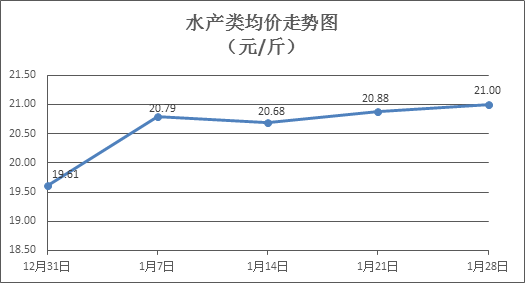 水产类商品价格略有上涨。上周所监测的10种水产商品价格波动情况为8涨1跌1平,综合均价为21.00元/斤,环比上涨0.56%。其中:草鱼、鲫鱼、罗非鱼、基围虾零售均价分别为每斤11.11元、13.73元、8.61元、34.85元,环比分别持平、上涨0.34%、下降0.35%、上涨1.01%。