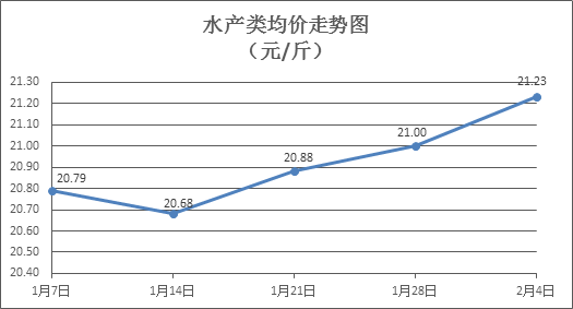 水产类商品价格以涨为主。上周所监测的10种水产商品价格波动情况为9涨1跌,综合均价为21.23元/斤,环比上涨1.10%。其中:草鱼、鲫鱼、罗非鱼、基围虾零售均价分别为每斤11.13元、13.76元、8.69元、35.45元,环比分别上涨0.18%、上涨0.22%、上涨0.93%、上涨1.72%。