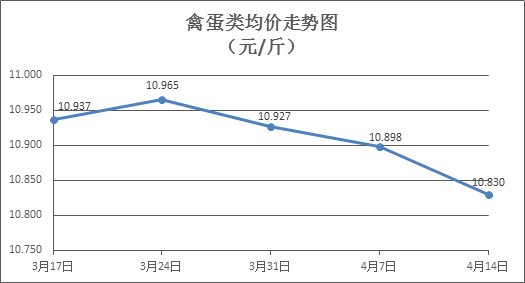 禽蛋类商品价格整体微降。所监测的6种禽蛋类商品价格波动情况为5跌1平,综合零售均价为每斤10.830元,环比下降0.63%。其中:白条鸡、白条鸭零售均价分别为每斤20.05元、14.86元,环比分别下降0.45%、下降0.67%;白壳鸡蛋、鸭蛋零售均价分别为每斤6.40元、7.47元,环比分别下降0.45%、下降1.84%。