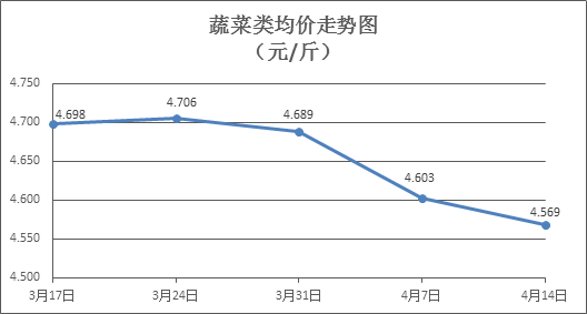 蔬菜类商品价格升降互现。所监测的32 种蔬菜商品价格波动情况为13涨18跌1平,综合零售均价为每斤4.569元,环比下降0.75%。其中:涨幅居前的品种包括花菜、菠菜、本地菜心,零售均价分别为每斤4.11元、4.69元、4.91元,环比分别上涨4.85%、4.45%、3.81%;跌幅靠前的品种包括丝瓜、水空心菜、白苋菜,零售均价分别为每斤5.39元、5.40元、4.50元,环比分别下降8.64%、7.53%、4.66%。