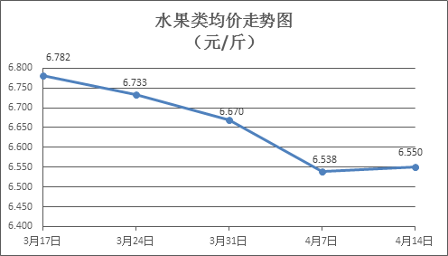 水果类商品价格窄幅盘整。所监测的6种水果商品价格波动情况为2涨2跌2平,综合零售均价为每斤6.550元,环比上涨0.18%。其中橙子、苹果、香蕉零售均价分别为每斤5.43元、7.42元、2.83元,环比分别上涨1.12%、持平、下降0.35%。