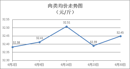 肉类商品价格微幅盘整。所监测的8种肉类商品价格波动情况为5涨3跌,综合零售均价为每斤32.45元,环比上涨0.18%。其中:排骨、精瘦肉、牛肉、带骨羊肉零售均价分别为每斤30.23元、18.51元、46.31元、43.89元,环比分别上涨0.43%、下降0.32%、下降0.79%、上涨0.23%。