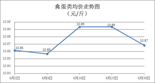 禽蛋类商品价格总体略降。所监测的6种禽蛋类商品价格波动情况为3涨3跌,综合零售均价为每斤10.87元,环比下降0.23%。其中:白条鸡、白条鸭零售均价分别为每斤20.19元、15.04元,环比分别下降0.15%、上涨0.33%;白壳鸡蛋、鸭蛋零售均价分别为每斤6.29元、7.51元,环比分别下降1.10%、上涨0.13%。