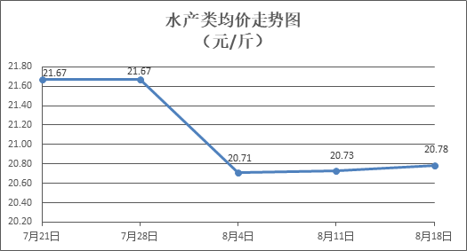 水产类商品窄幅盘整。所监测的10种水产商品价格波动情况为5涨2跌3平,综合均价为每斤20.78元,环比上涨0.28%。其中:草鱼、鲢鱼、鲈鱼、罗非鱼、基围虾零售均价分别为每斤11.21元、9.58元、21.46元、8.93元、29.89元,环比分别持平、上涨1.16%、下降0.14%、持平、上涨1.05%。