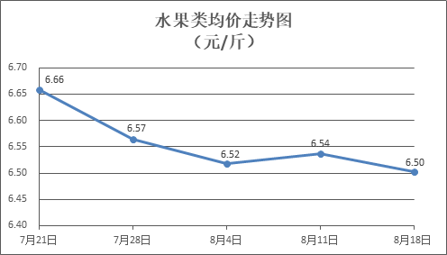 水果类商品价格涨跌互现。所监测的6种水果商品价格波动情况为3涨3跌,综合零售均价为每斤6.50元,环比下降0.51%。其中橙子、葡萄、西瓜零售均价分别为每斤5.80元、13.41元、3.23元,环比分别上涨1.40%、下降2.61%、上涨1.57%。