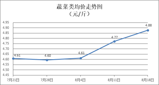 蔬菜类商品价格普涨。所监测的32 种蔬菜商品价格波动情况为26涨4跌2平,综合零售均价为每斤4.88元,环比上涨2.22%。其中:涨幅居前的品种包括莴笋、西红柿、花菜,零售均价分别为每斤4.91元、4.78元、5.46元,环比分别上涨11.59%、9.63%、5.20%;跌幅靠前的品种包括丝瓜、土豆、红萝卜,零售均价分别为每斤5.03元、2.98元、3.04元,环比分别下降2.33%、0.67%、0.33%。