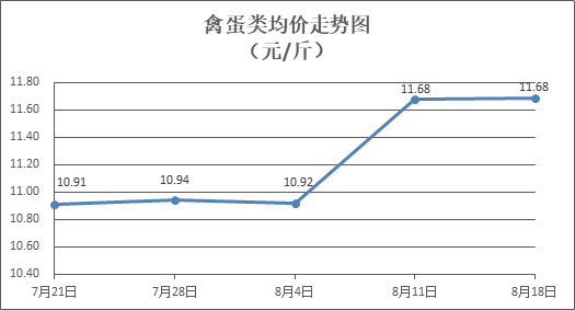 禽蛋类商品价格稳中略涨。所监测的5种禽蛋类商品价格波动情况为3涨1跌1平,综合零售均价为每斤11.68元,环比上涨0.05%。其中:白条鸡、白条鸭零售均价分别为每斤20.02元、15.23元,环比分别上涨0.05%、上涨0.26%;白壳鸡蛋、鸭蛋零售均价分别为每斤6.49元、7.68元,环比分别下降0.46%、上涨0.13%。