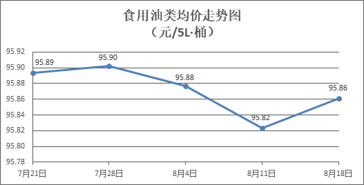 食用油类商品价格略有回升。所监测的9种食用油(5L装)商品价格波动情况为4涨2跌3平,综合零售均价为每桶95.86元,环比上涨0.04%。其中:胡姬花花生油、玉米油零售均价分别为每桶144.75元、77.54元,环比分别上涨0.23%、上涨0.13%。
