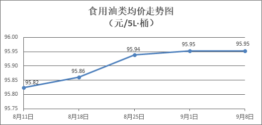 食用油类商品价格保持稳定。所监测的9种食用油(5L装)商品价格均持平,综合零售均价为每桶95.95元。其中:鲁花花生油、金龙鱼调和油零售均价分别为每桶154.40元、71.57元,环比均持平。