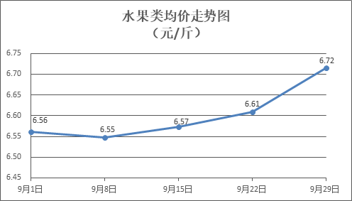 水果类商品价格稳中有涨。所监测的6种水果商品价格波动情况为2涨2跌2平,综合零售均价为每斤6.72元,环比上涨1.61%。其中橙子、苹果、葡萄零售均价分别为每斤6.75元、7.53元、13.42元,环比分别上涨9.58%、持平、上涨0.83%。