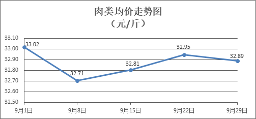 肉类商品价格总体略降。所监测的8种肉类商品价格波动情况为2涨5跌1平,综合零售均价为每斤32.89元,环比下降0.18%。其中:排骨、精瘦肉、牛肉、带骨羊肉零售均价分别为每斤32.85元、20.53元、45.72元、41.52元,环比分别下降0.58%、下降0.44%、下降0.04%、上涨0.31%。