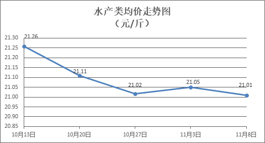 水产类商品价格升降互现。所监测的9种水产商品价格波动情况为5涨4跌,综合均价为每斤21.01元,环比下降0.16%。其中:草鱼、鲫鱼、罗非鱼、海虾零售均价分别为每斤11.07元、13.91元、9.04元、49.00元,环比分别上涨0.31%、上涨0.28%、下降0.07%、下降1.21%。
