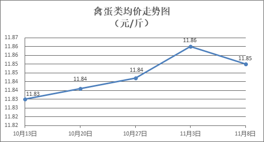 禽蛋类商品价格微幅盘整。所监测的5种禽蛋类商品价格波动情况为3涨2跌,综合零售均价为每斤11.85元,环比下降0.03%。其中:白条鸡、白条鸭零售均价分别为每斤20.46元、15.34元,环比分别上涨0.08%、下降0.11%;鸡蛋、鸭蛋零售均价分别为每斤6.58元、7.71元,环比分别上涨0.46%、下降0.66%。